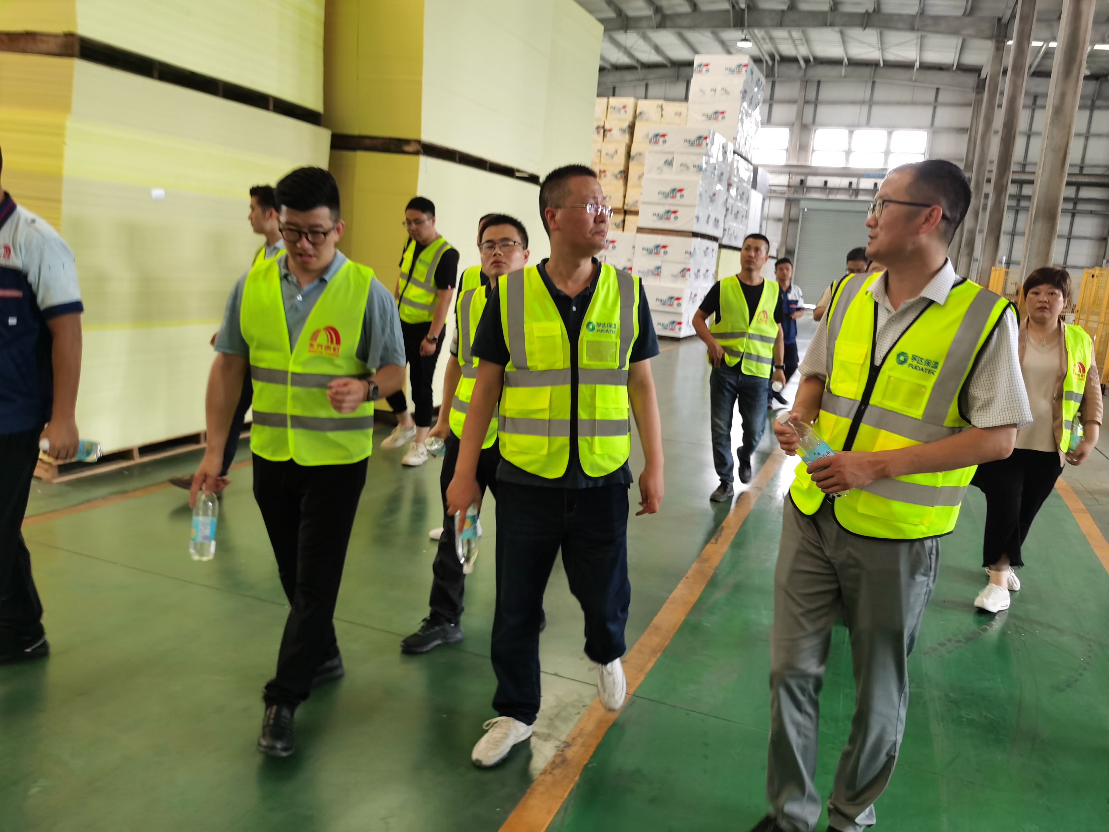 一行嘉賓首先參觀了蕪湖工廠XPS、EPS、干式地暖、保溫隔聲裝飾樓地面一體磚、高強度保溫裝飾屋面一體磚等核心產品生產車間,了解各產品生產工藝、原材料及品控等情況,其中重點參觀調研干式地暖、保溫隔聲裝飾樓地面一體磚、高強度保溫裝飾屋面一體磚等裝配式建筑相關新產品,并了解相關產品施工工藝及市場應用情況,對孚達公司產品創新力及技術發展方向表示贊同,并對產品生產全過程堅持低碳環保理念給予肯定。