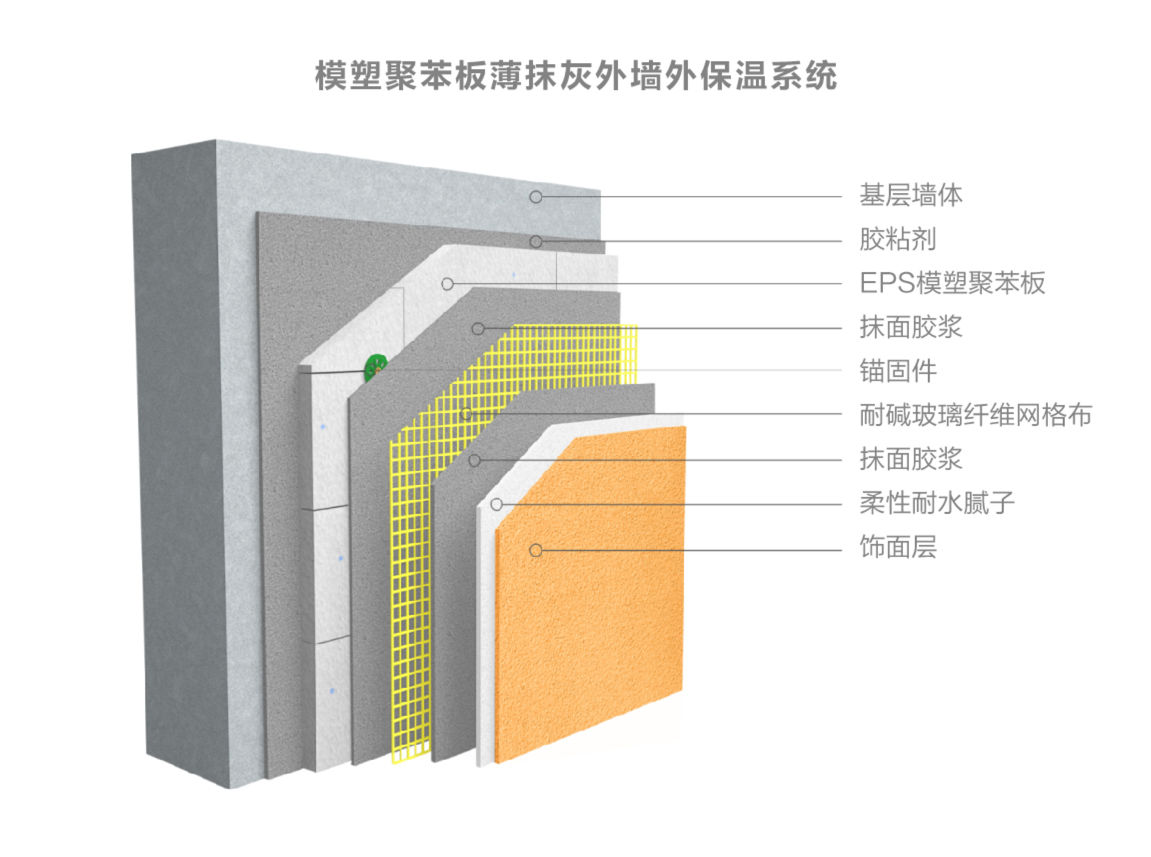 置于建筑物外墻外側,與基層墻體采用粘接方式固定的保溫系統。系統由模塑聚苯板 / 巖棉板 / 巖棉條、膠粘劑、抹面膠漿、耐堿玻璃纖維網格布及飾面材料等組成,系統還包括必要時采用的錨固件、護角線條、托架等配件以及防火構造措施 。