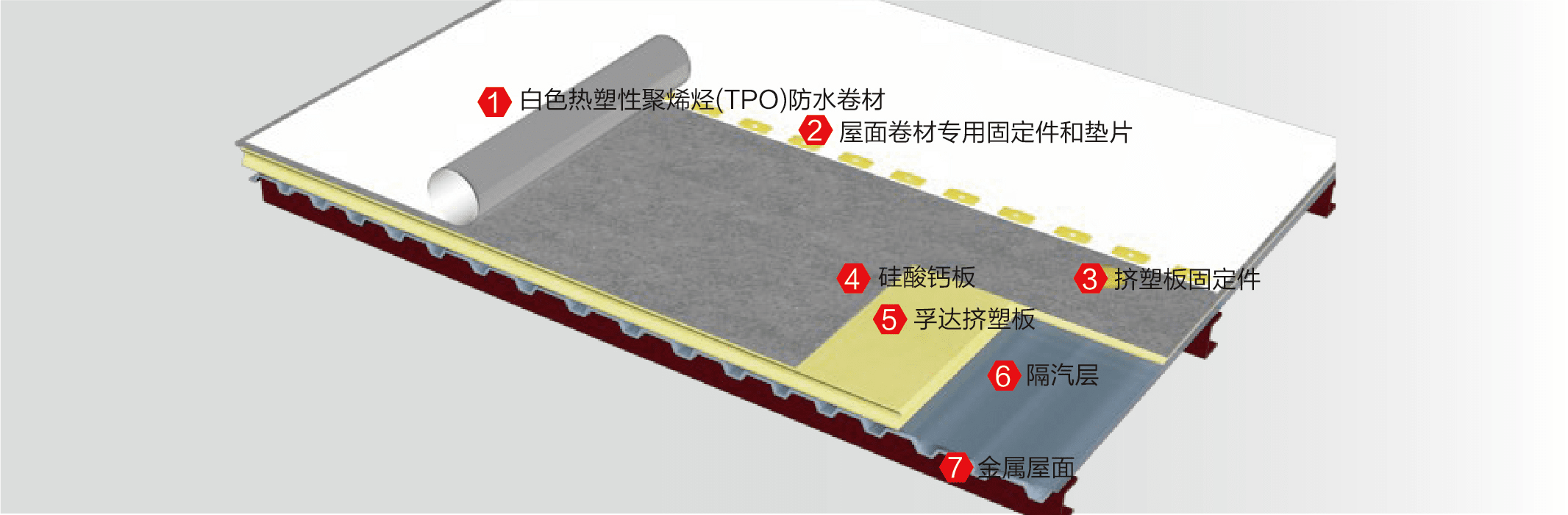 白色TPO/FPO卷材或帶背襯的PVC卷材可無須另設隔汽層,孚達擠塑板與硅酸鈣板在工廠復合,施工方便快捷。